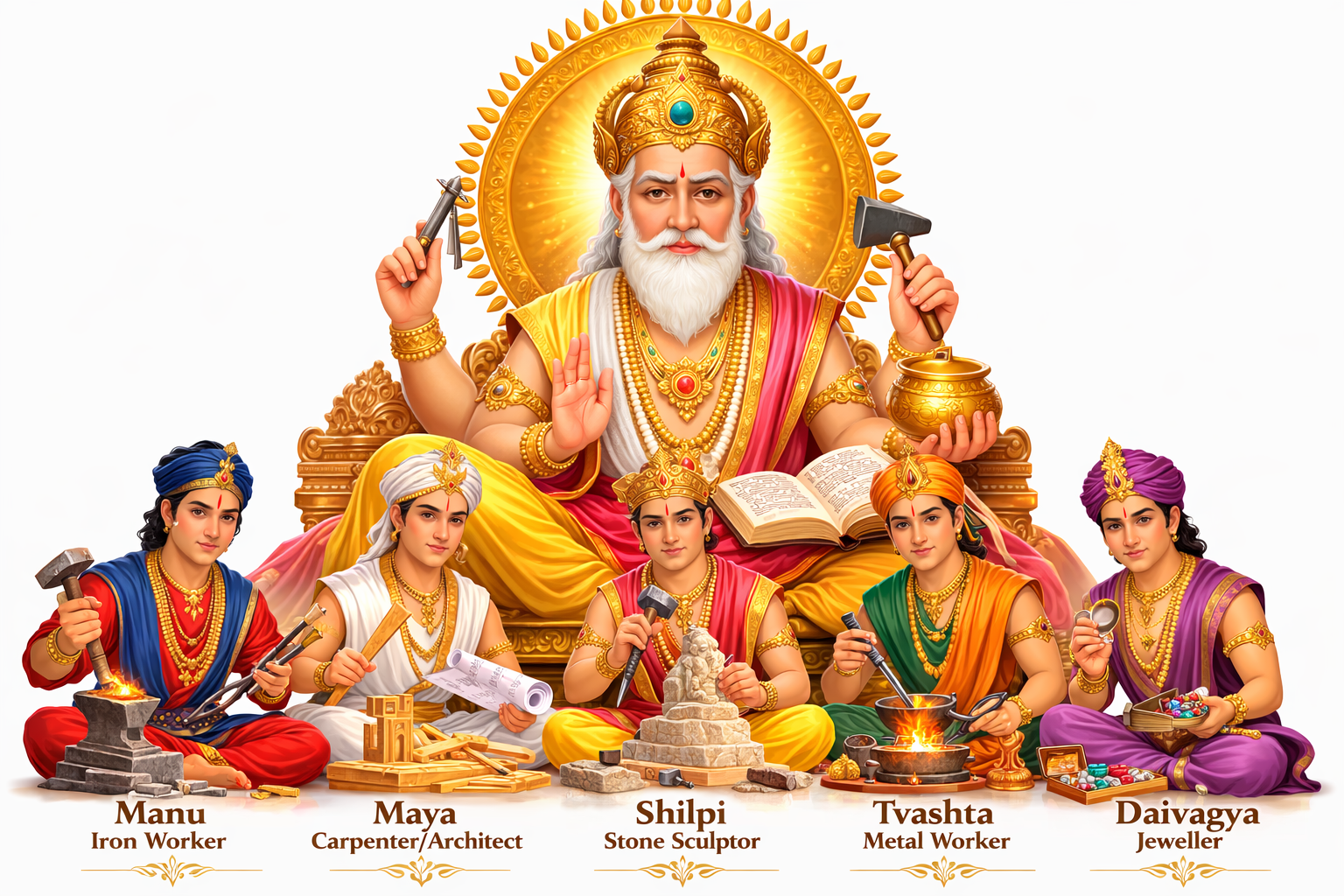 According to tradition, Lord Vishwakarma had five sons whose descendants form the five branches of the Vishwakarma community.